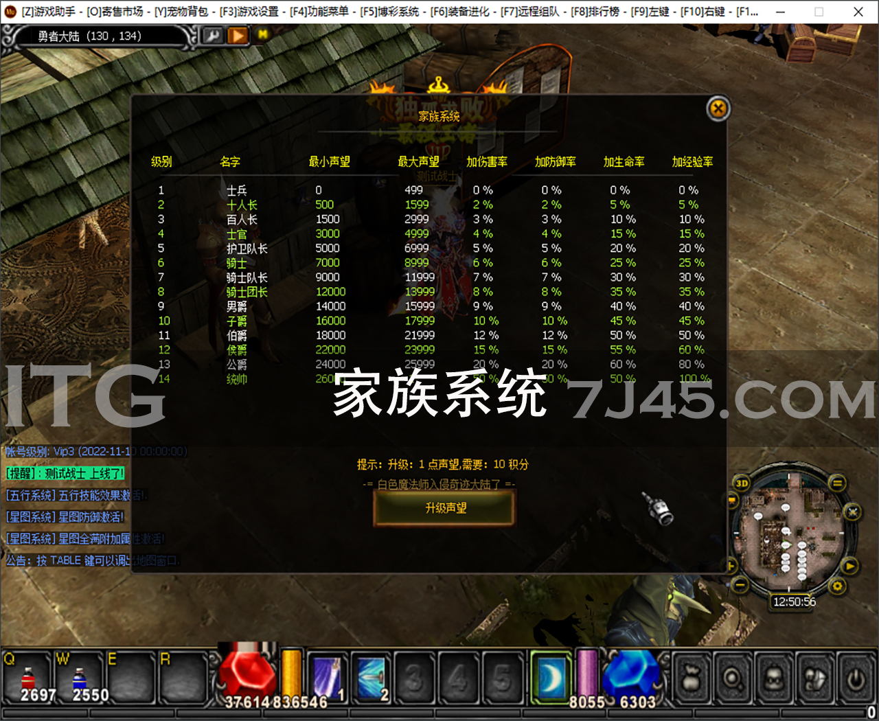 - F3 键启动,按照家族等级排名奖励攻防可以使用积分、元宝升级